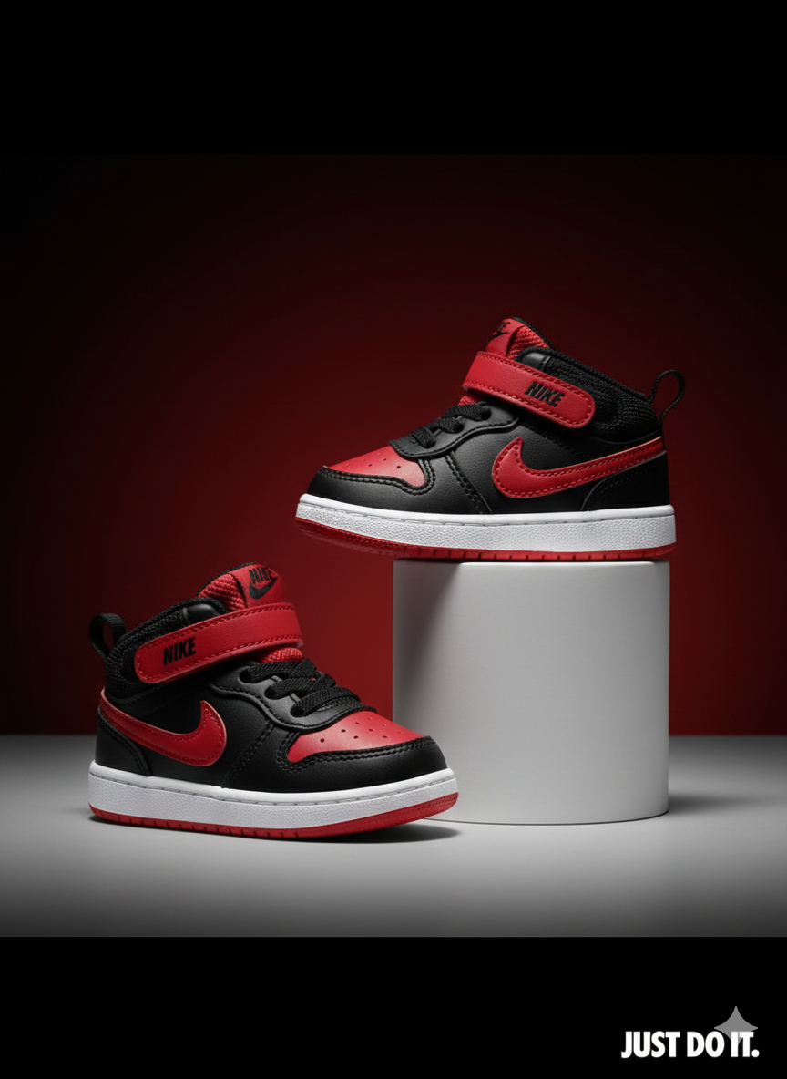 Designed for little movers with big energy, these Nike Toddler High-Top Sneakers deliver comfort, support, and iconic style. Featuring a classic black and red colorway with the signature Nike swoosh, these shoes are built for everyday wear, playtime, and early adventures.