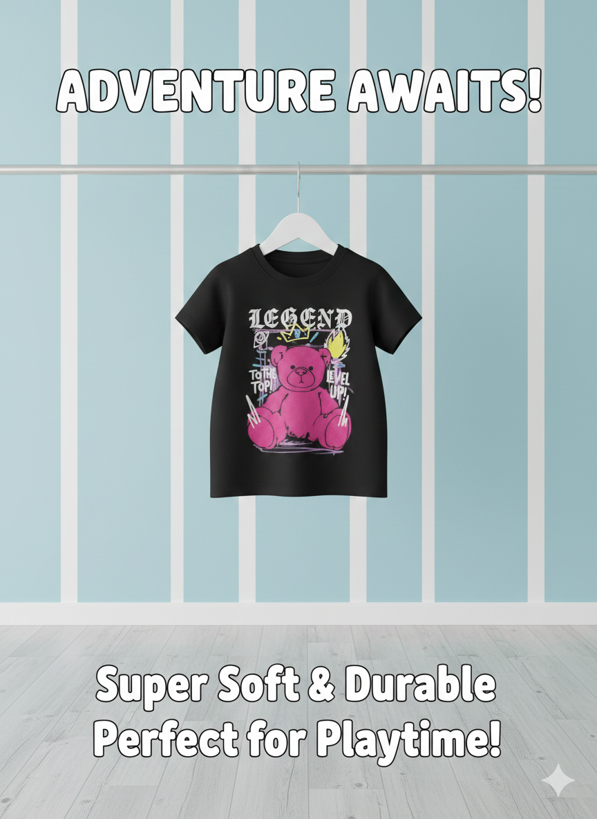 Kids “Legend” Graphic T-Shirt – Black Tee with Pink Bear Design