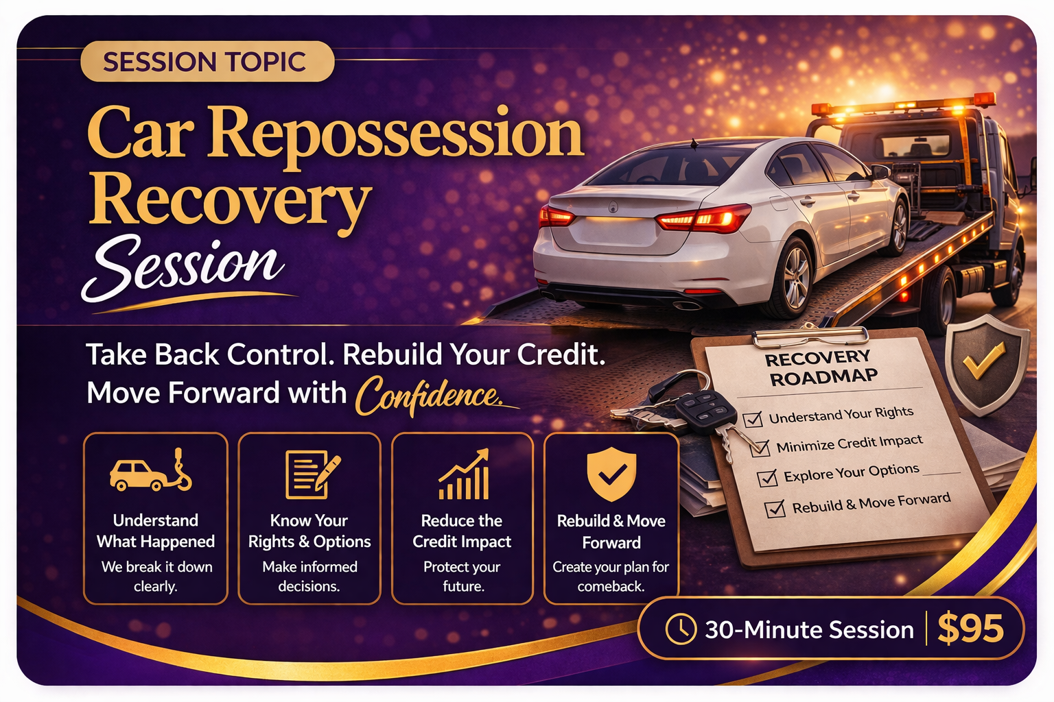 This session helps you understand what happens after a car repossession and how to recover. We’ll review your rights, credit impact, and steps to rebuild your financial stability.