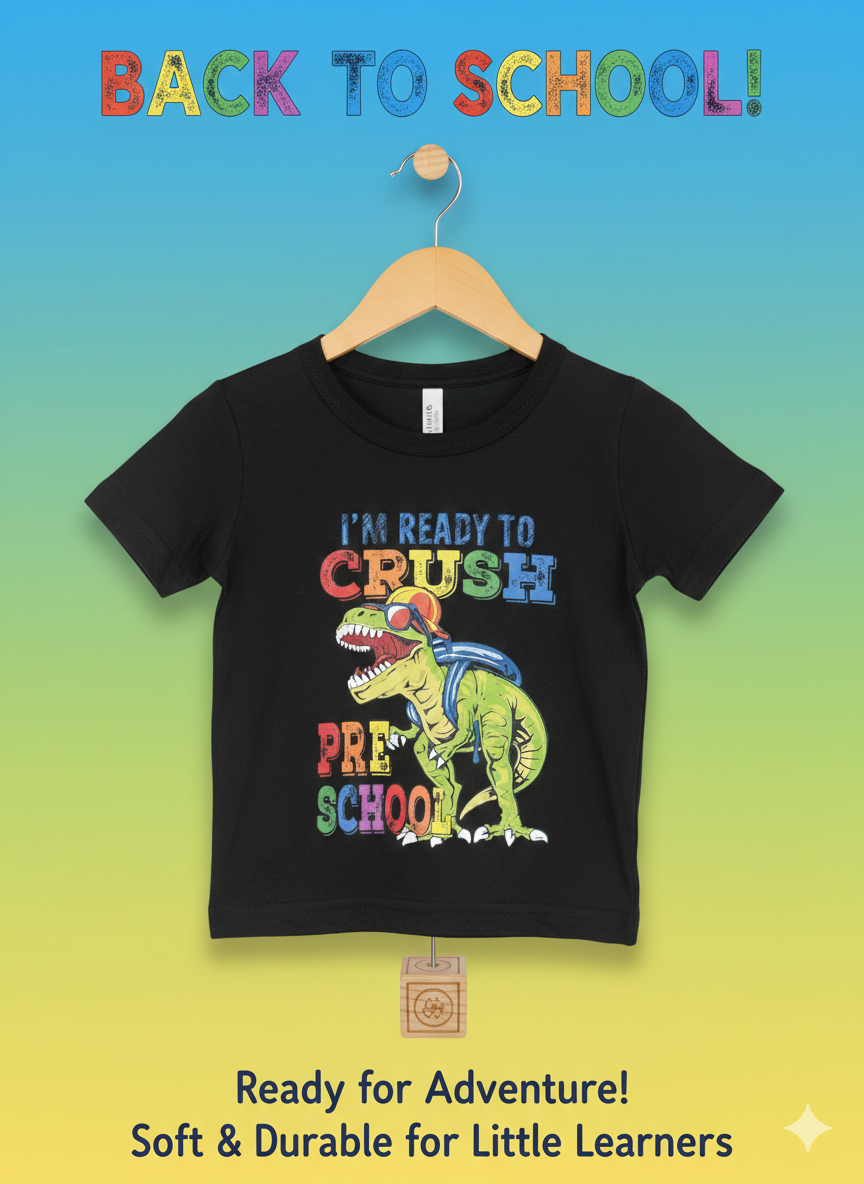 Let your little one roar into learning with this “I’m Ready to Crush Pre-School” dinosaur t-shirt! Designed for comfort and confidence, this playful tee features a bold dinosaur graphic with a fun school-ready message. Perfect for preschool, playdates, and everyday adventures.