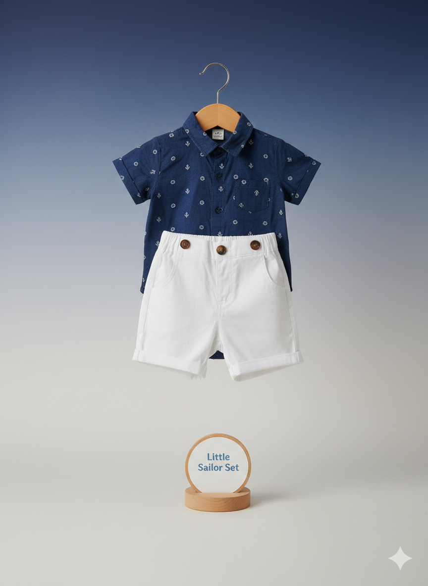 • Navy short-sleeve button-up shirt with subtle sailor-style print